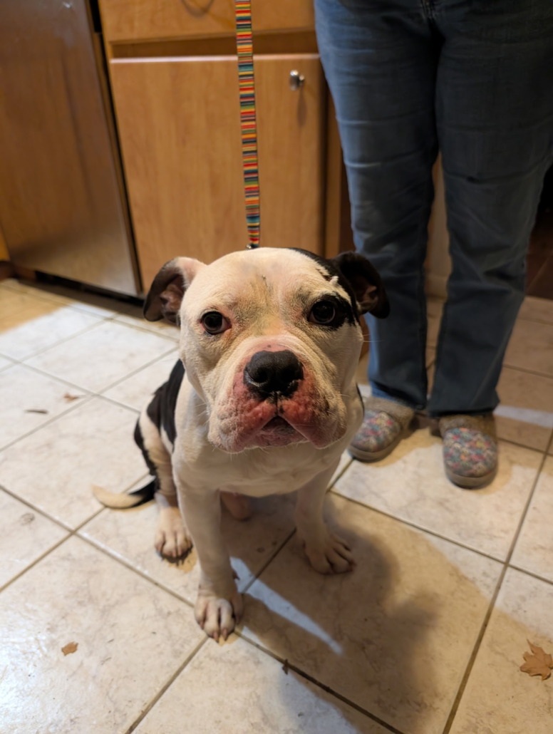 He is an unaltered male Pitt mix with a black and white body and mostly white face. Very malnourished so may have traveled a distance. Very friendly and submissive. Gentle and affectionate
