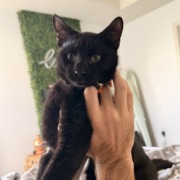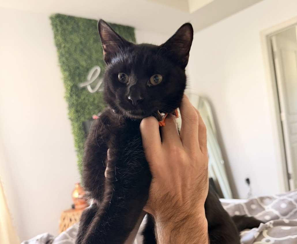 All black. Small bald patch on his right front leg. Green eyes. Front declawed. Was wearing an orange break-away collar with bell when he went missing. Has never been outside. 9 months old.