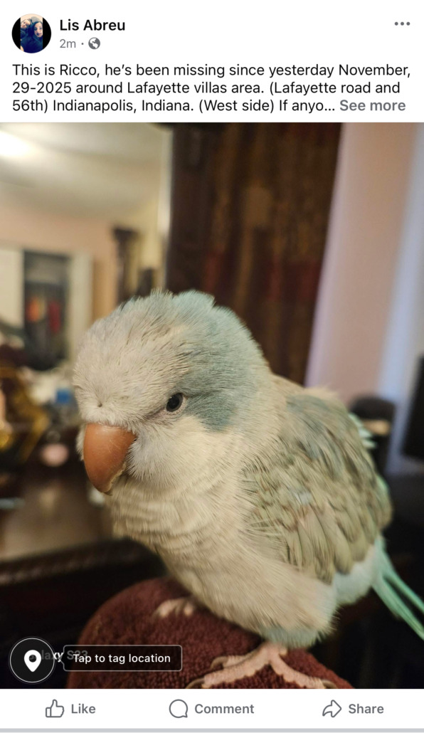 This is Ricco, a Quaker parrot, he’s been missing since yesterday November, 29-2025 around Lafayette villas area. (Lafayette road and 56th) Indianapolis, Indiana.