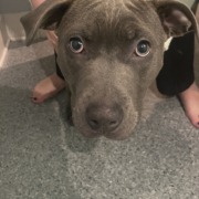 This sweet boy is a grey with a stripe of white on his chest. He was found with a harness on him but no collar with a name. Proof of ownership is required.