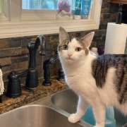 Not quite 1.5yr old female but long bodied & long tailed for a girl cat. About 10lbs. Black & white tabby but with lots of large white patches. One eye looks like it has black eyeliner but the other eye is unlined. Nose is completely pink & her all white whiskers turn down. Under her chin is a very faint tan splotch that looks like she’s dirty in just that spot. Two large irregular black spots on hind leg; 3 small black spots on bum. Generally friendly but wary of strangers only likes the cats she lives with. Loves treats.
