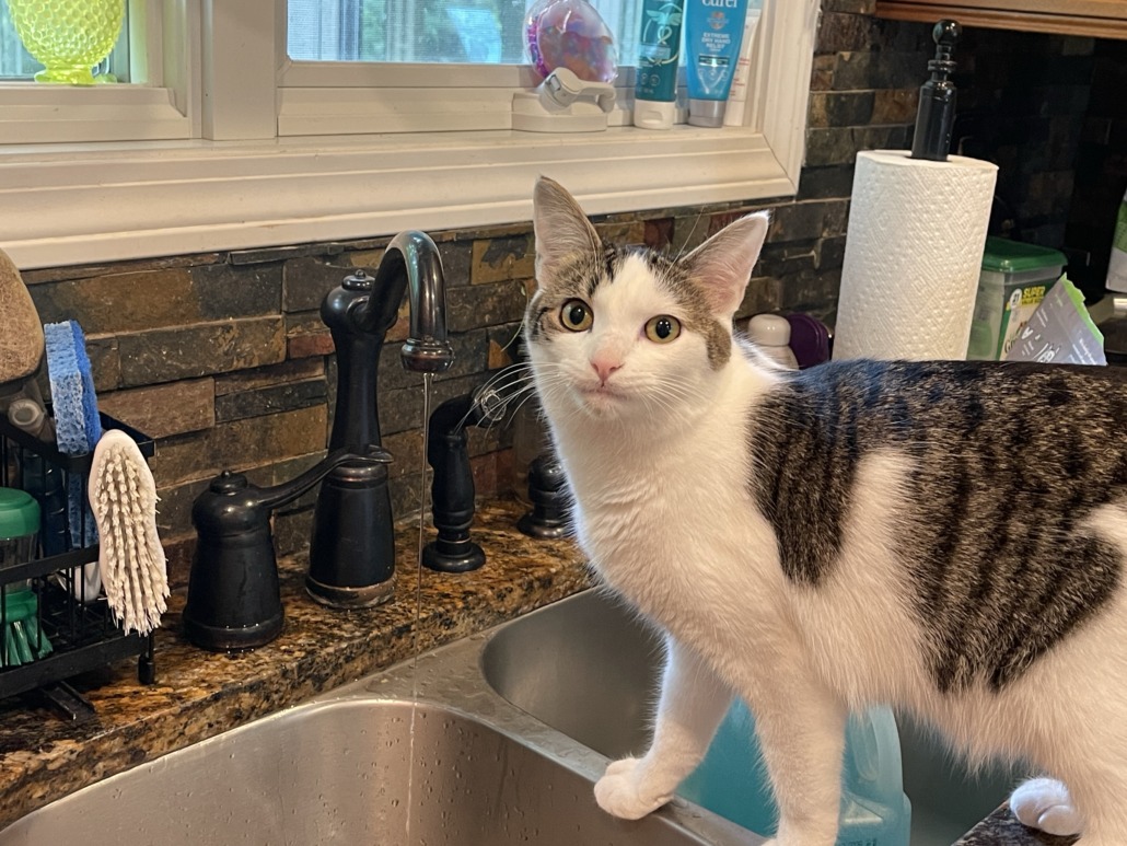 Not quite 1.5yr old female but long bodied & long tailed for a girl cat. About 10lbs. Black & white tabby but with lots of large white patches. One eye looks like it has black eyeliner but the other eye is unlined. Nose is completely pink & her all white whiskers turn down. Under her chin is a very faint tan splotch that looks like she’s dirty in just that spot. Two large irregular black spots on hind leg; 3 small black spots on bum. Generally friendly but wary of strangers only likes the cats she lives with. Loves treats.