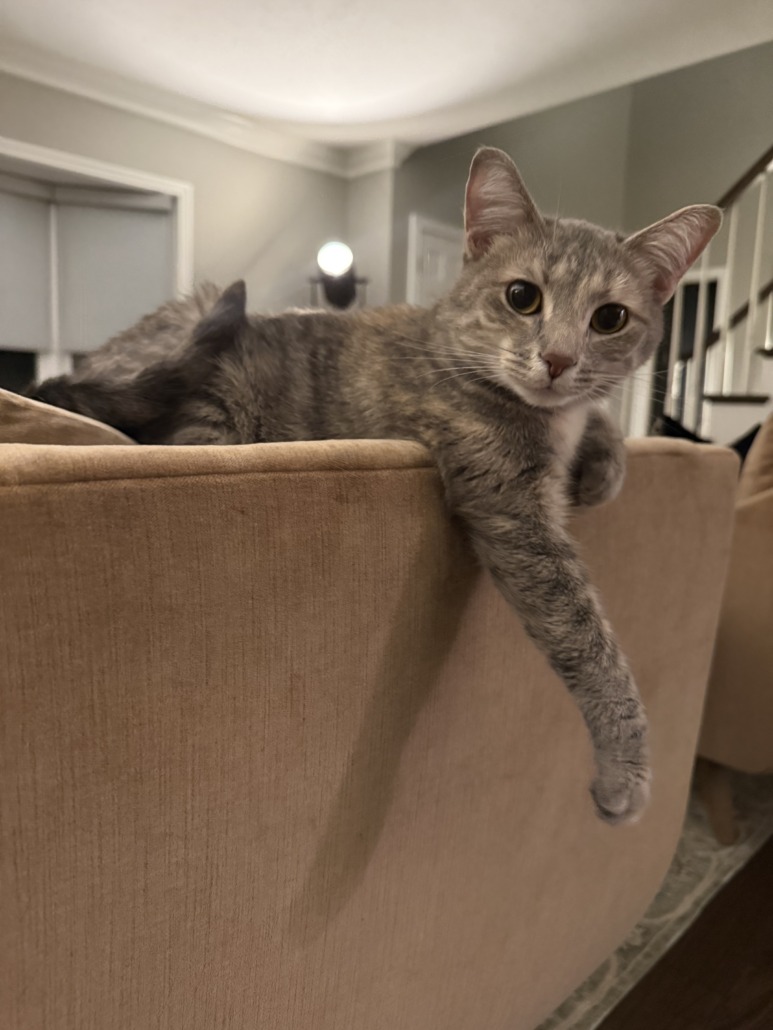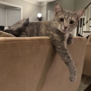 Gray medium (7 lbs) female cat. She is extremely friendly and should come up to anyone! She is the best girl and was let out by my elderly grandmother