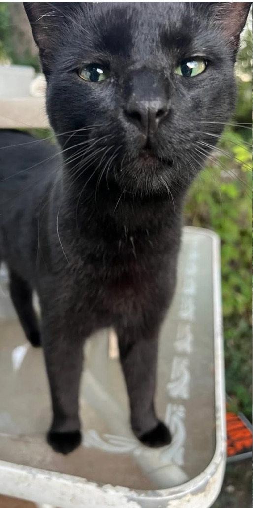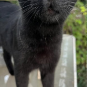 Black male cat, he’s a big boy with an unusual face. Very friendly and loves to cuddle.