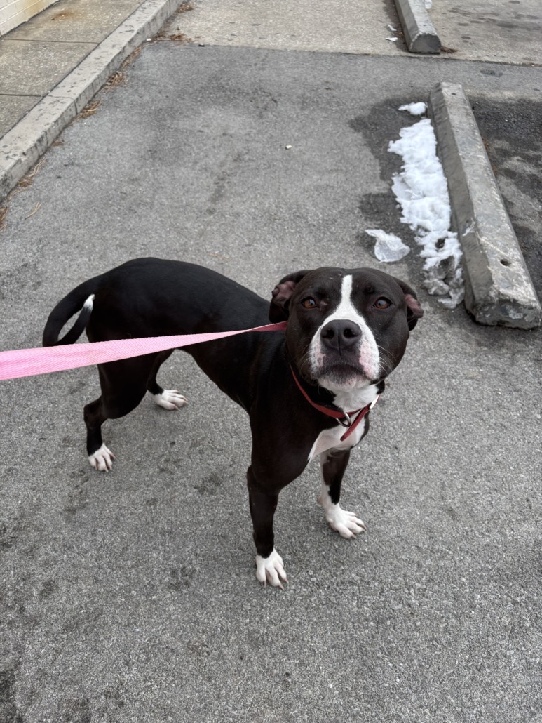 Mostly black female pitbull wearing a red collar. Found running on Emerson and 21st St with a grey/merle intact male mixed breed. Both very sweet and friendly. Both are contained at the thrift store at Otterbein United Methodist Church for now