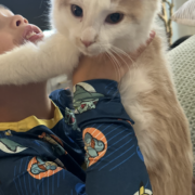 Tobi is a small male cat that we rescued. He’s been with us for a month and we love him so much! Because he came from outside he’s curious and we think he may have slipped out somehow. He’s so small and sweet!