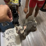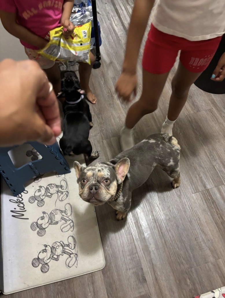 Yeezy is a small frenchie that is Merle. One ear is dropped low because of a cartilage damage from a prior ear infection. He was last seen near 21st post/mitthoefer area last night with red grinch pajamas on.