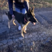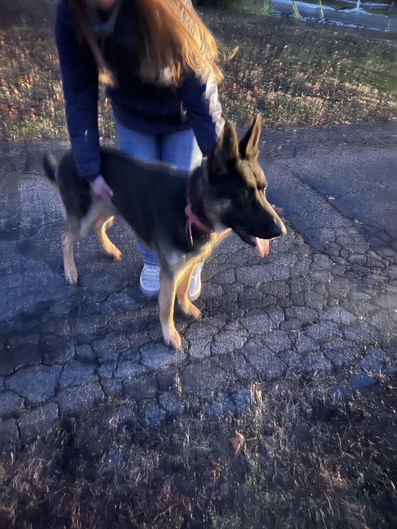 Young German shepherd with red or pink Kong collar, no tag. Running down Dean road near 75th street.