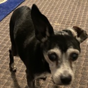 Older dog thin small blue collar on short coarse hair . Collar had no tags. Dog was found on young lake Dr in the creekside woods housing Addition. Freezing cold.