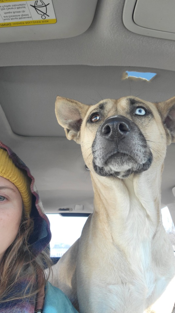 No chip or collar. She is not fixed and looks like she’s had puppies before. Very friendly. Black around the mouth and eyes seems to be a Shephard mix. Found with a larger male seem to be bonded.