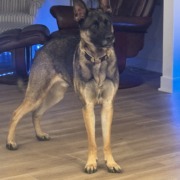 German shepherd. Female. Has a color but no tag. The collar says “Mama says I’m special “.