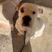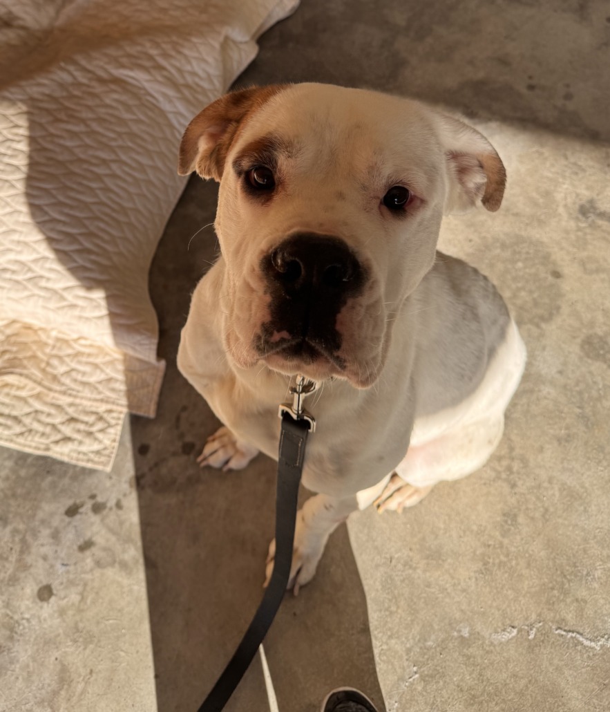 White and brown, Male, Boxer Mix. Approximately 70 Ilbs, proof of ownership required.