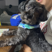 Small black Dog with some gray fur. He has a bandana on. Very friendly