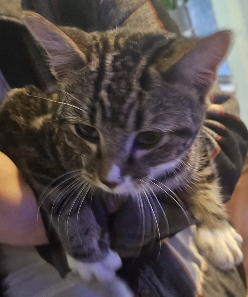 Very friendly, black white and gray tabby. Found in Winding Ridge. Proof of ownership required to claim.