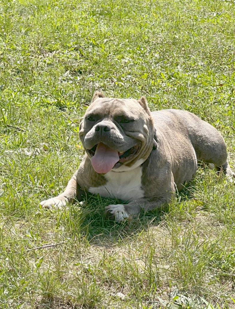 Pocket bully , more afraid of men but loves women. White chest and is mostly a grey with brown. Very sweet but might not approach you.