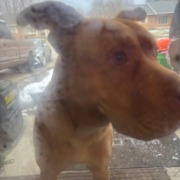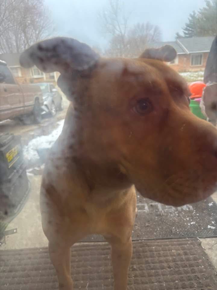 Found cuddling on our porch in the freezing weather. Brought her in, looking for owner. Proof of ownership required!!!!!! Red Nose Pit