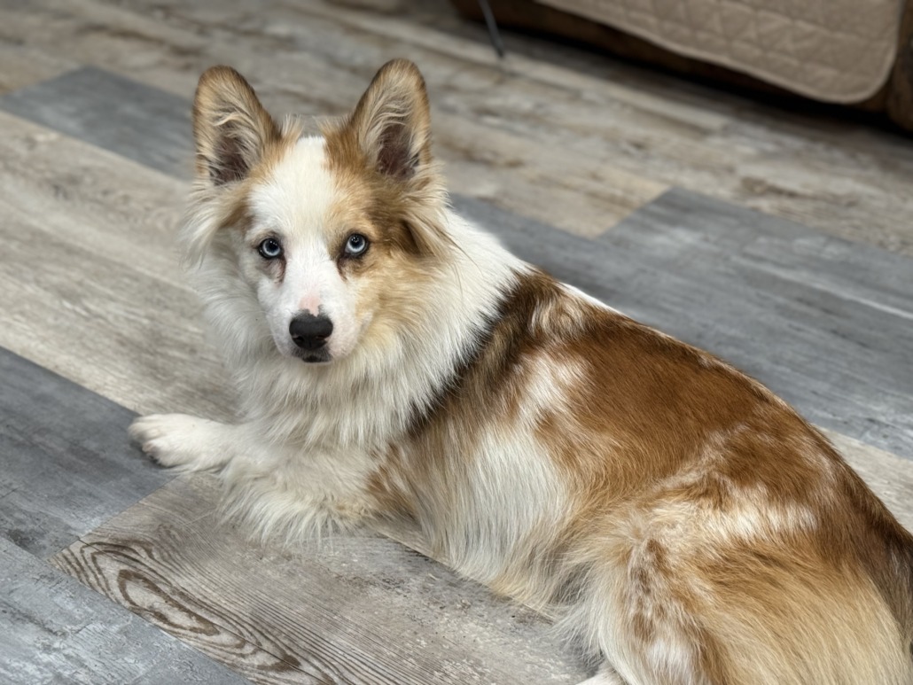 Maggie is a corgi about 20lbs. She’s white primary and has multi colors of brown. Her hair is long. She is chipped and has two collars one is pink with a shock collar and an orange with her tracking devise attached. Under the devise is a tag that has our information listed.