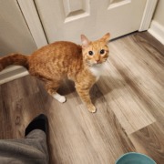 Orange tabby with white chest and paws, intact male, very friendly, asked a few neighbors and no one claimed him. Says he’s been there for a while.