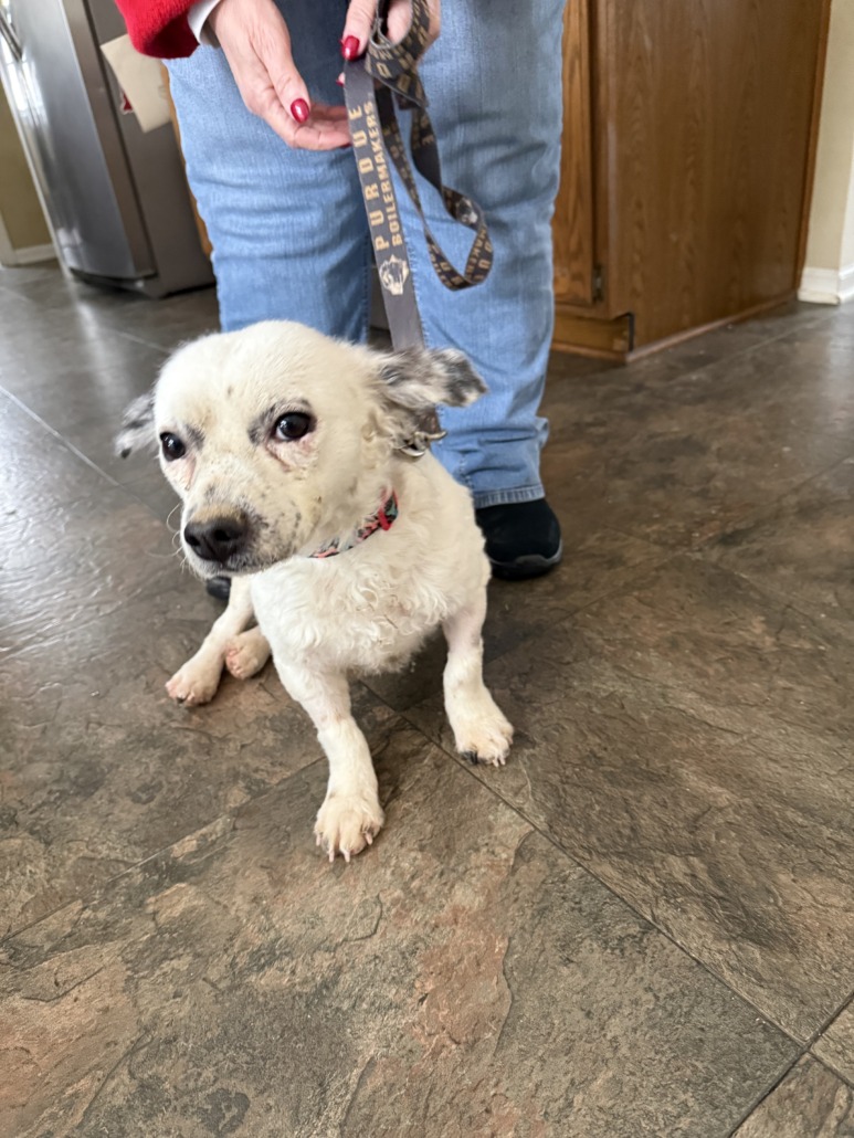 Small white male dog with black and white spotted ears.