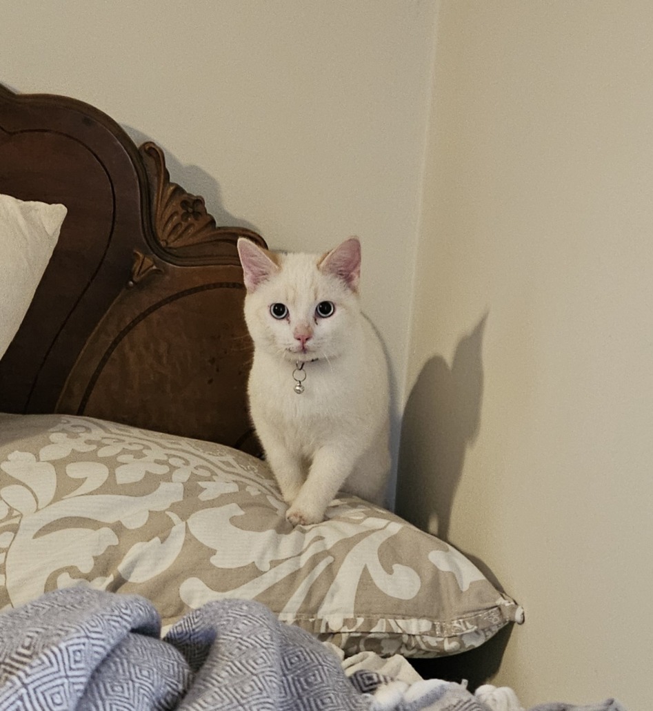 Proof of ownership required. Pink collar with bell, not chipped. Mostly white with light tan ears and striped tail.