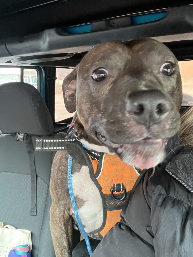 Found dog at gas station at Shelby/Pleasant Run. Wearing orange harness when found. Very friendly, looks healthy, not neutered.