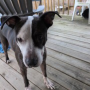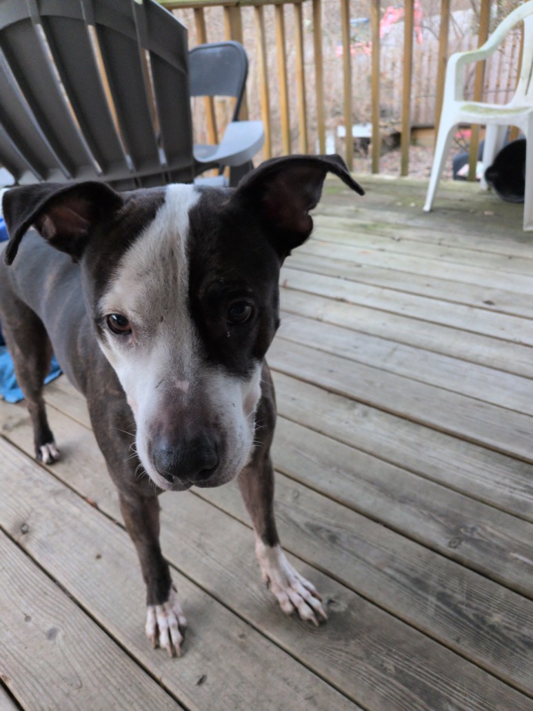 Mostly brindle with some white on his chest, neck and head. Photo proof of ownership required.