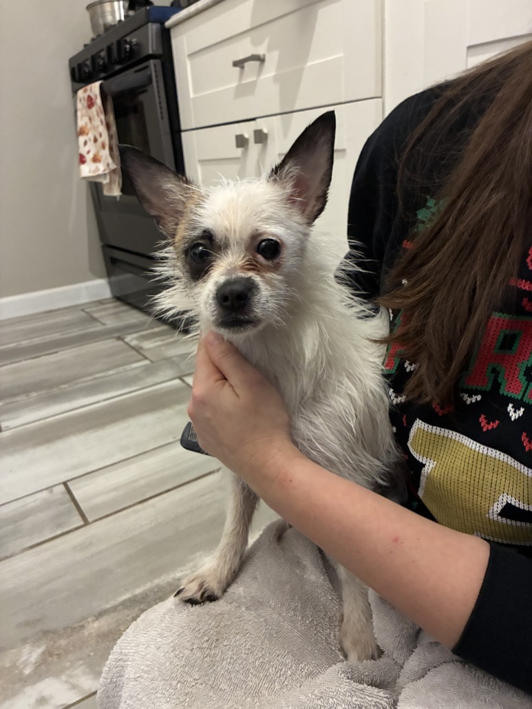 Small looks like to be a chihuahua breed tan white and black found at Scecina memorial high school