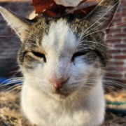 Black and white short hair tabby. He has a white looking diamond on his back. Blind in his left eye.