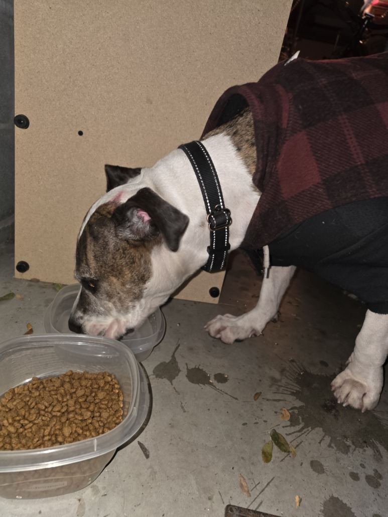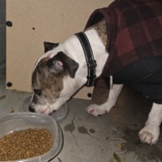 Well-behaved brindle pittie with graying muzzle. Found with leash and sweater on.