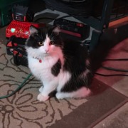 Stella Long Hair Black and White Pink Collar with Red Bell. Tipped ear, spayed