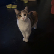 Calico kitty with lots of white. Full with belly but calico on her back. Very shy! Super sweet and quiet meow.