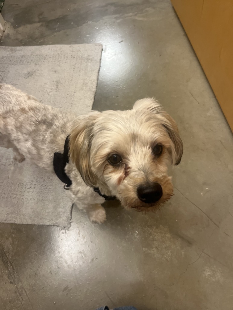 a friend found this dog near Stadium Lofts Apartments (Stadium Way) tied to a lamp post with a leash and food this morning in the freezing cold. He looks recently groomed, and is chipped. A message was left with the phone number on the chip but no response yet. Not sure what the story is. Does anyone recognize this dog? Should he be returned if he was left stranded in the freezing cold? He is very sweet and understandably scared.