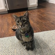 Gray cat that looks as if she had beige stripes on her back; mint green collar. Very friendly and sociable. Yellow/green eyes