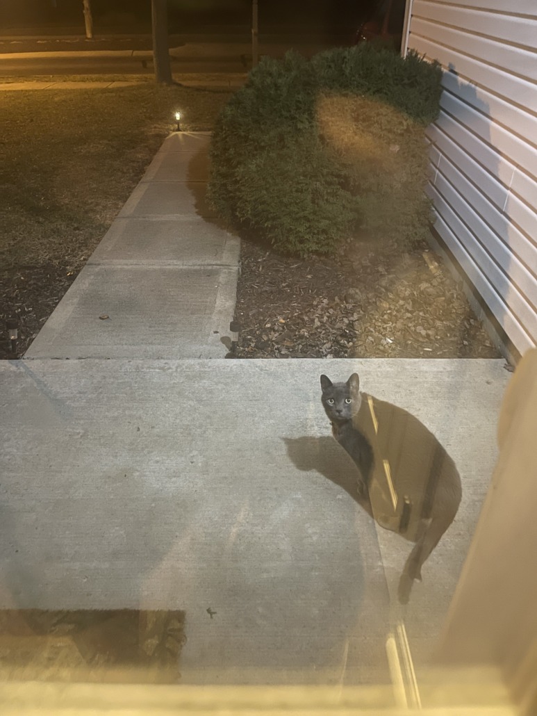 The cat was dark grey 🌸 had a collar with a bell and had red in the collar. The cat look very well fed. Seemed friendly but wasn’t sure if they could trust me or not 🌸