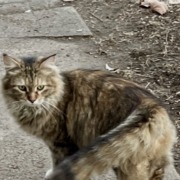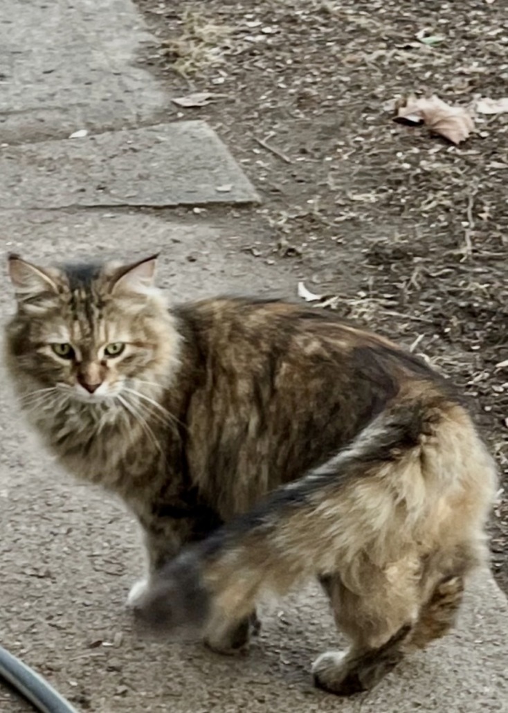 Very affectionate kitty. Neighbor said they have been feeding it for about a week, so not sure how long it has been lost. Kitty is currently hanging on our porch in a box.