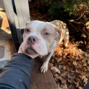 Brown and white pittie/bully mix. Looks like she had puppies recently. She is loose at A62 Apartments near unit 185. We tried to catch her but keeps shying away. Very sweet but timid. Smells nice and looks clean. Proof of ownership required.