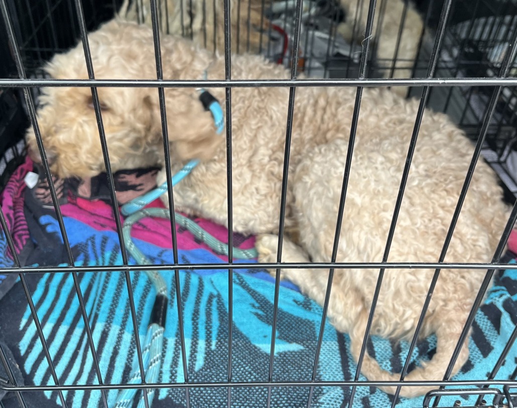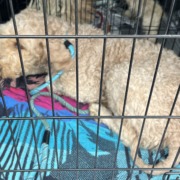 Medium sized Doodle, cream colored, female. Wearing a collar with leash attached.