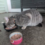 Gray tabby cat male unfixed with a red/yellow/green collar with a black bell on it. Super friendly so I brought him into my garage to wait for his owner. Unfortunately we can’t keep him for that long since we have 2 female cats in the home, but he’s been fed and used the litter box we made him. We’ll have him for the day and after that we’ll take him to the closest shelter to see if he’s chipped and let them hold him until the owners are found.