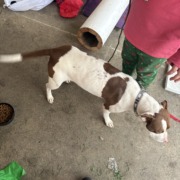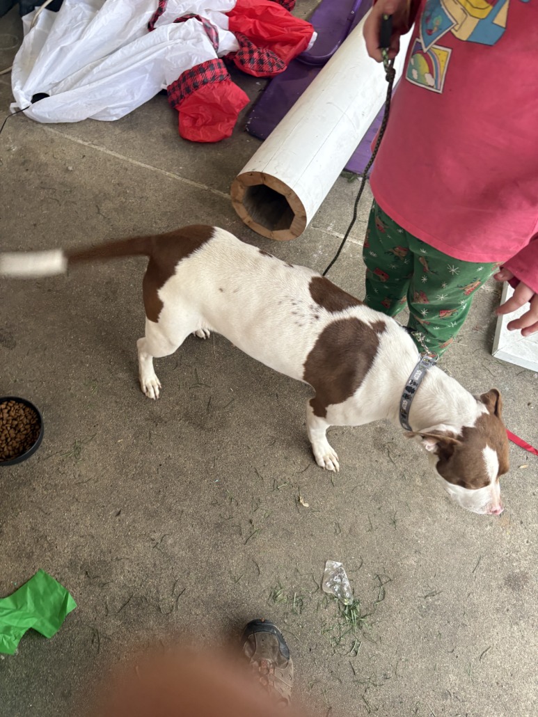 Female boxer. White with brown spots. Appears to have recently born a litter of puppies. Found with a Star Wars collar