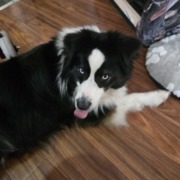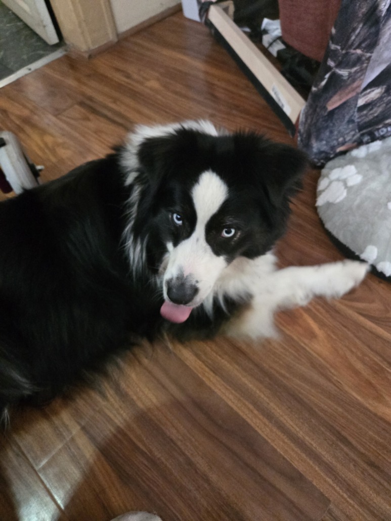 Black and White border collie. Very friendly and well behaved. Light blue eyes