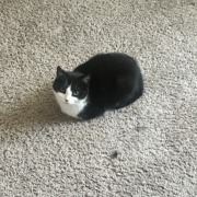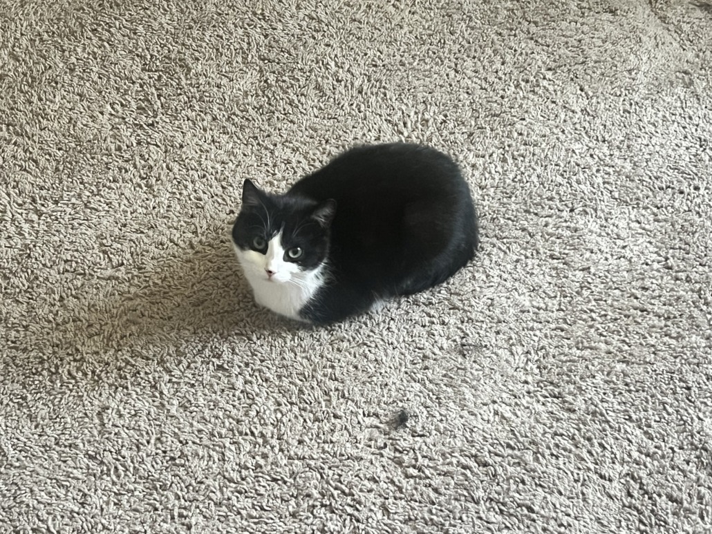 He’s a tuxedo cat. Roughly 5lbs. His tail is short and kinked at the end, and he is intact. He ran out of our garage when our door blew open. He is friendly, he may be somewhat skittish at first but he’s a sweet cat.