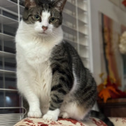 He’s a tabby with a lot of white. He’s skiddish but very affectionate