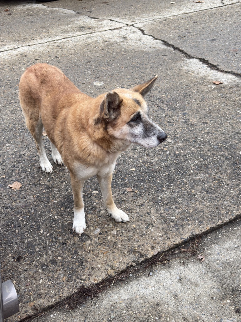 Tan and white female dog. Wearing red collar but no tag.