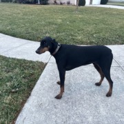 Large dog, thinking a Doberman. He is microchipped but there is no owner registered to the chip. Ears are cropped down. Proof of ownership is required to pickup pet.