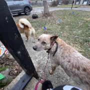 Gracie is my Heeler she is chipped. Butters is my husky they should be together. They slipped out the back fence earlier today and we haven’t been able to find them. Butters has on a green collar. Gracie’s pink collar may have come off as it was having trouble staying latched. They should both have correction collars on.