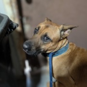 Large brown dog thick blue collar, black sunspot on his face, not neutered, friendly.