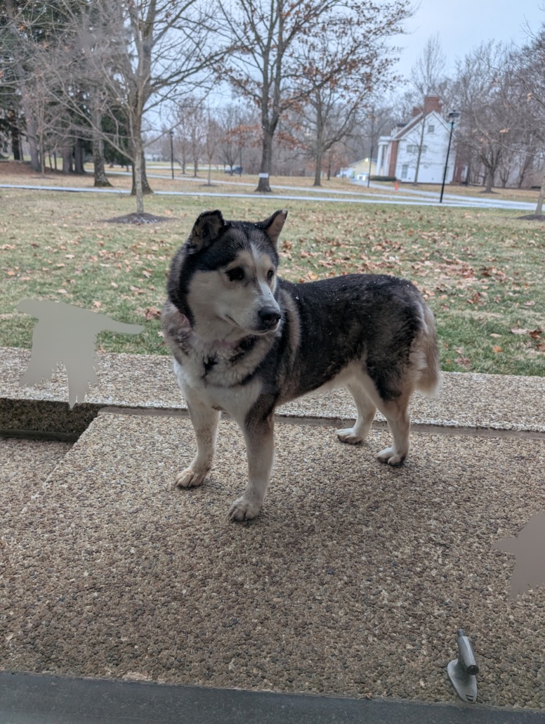 Seen at butler campus at cafe south (next to shelton auditorium) husky/mix breed dog with pink collar and no tag. She is super nice but absolutely did not allow us to put on a leash. Besides being a bit dirty, seems well fed.