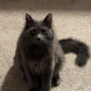 Fluffy grey cat! Pretty big boy, somewhat friendly. We had a furnace issue and had to open the door and he took off