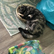 She’s a colorful tortie with 1 orange foot, the rest are black. She’s 11 pounds, she’s got green eyes, a long tail.