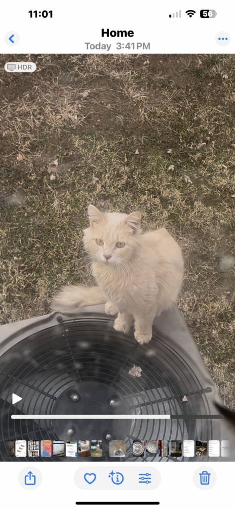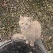 Orange kitty, fluffy tail, friendly, does not act like it belongs outside also does not act like it belongs in the area. Very skittish of surroundings but not afraid of me.